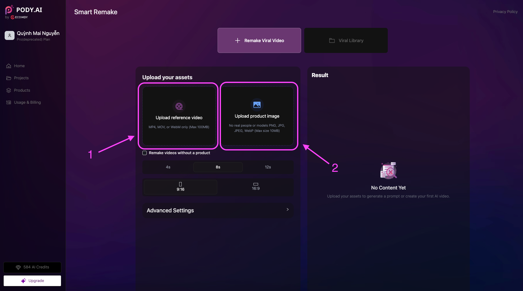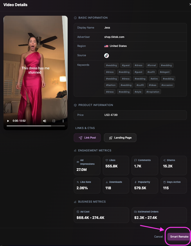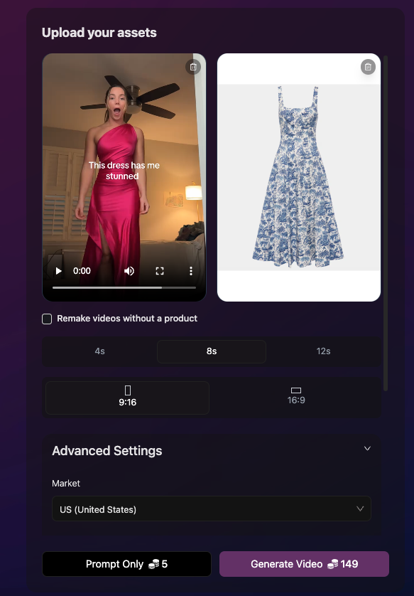 Smart Remake allows you to recreate high-performing or viral videos by keeping the original storyline while automatically replacing products or creative elements using AI.