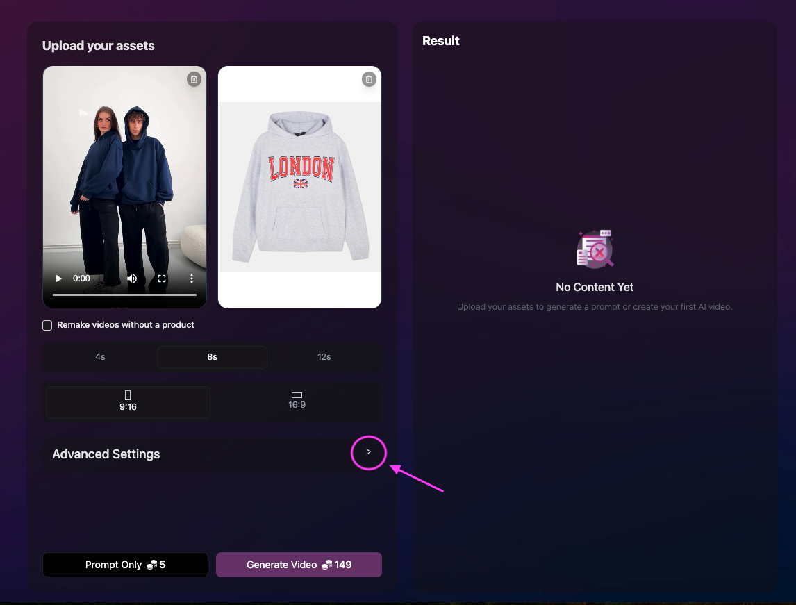 - Upload the original video, your product image.