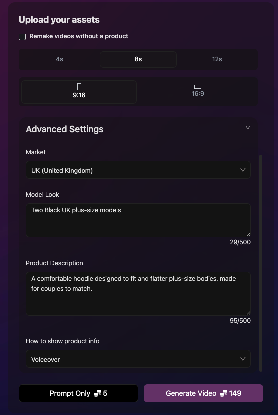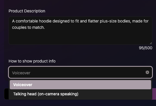 - If you add product description, choose how to show it: Voice-over (narration) Talking-head (the model speaks to camera)