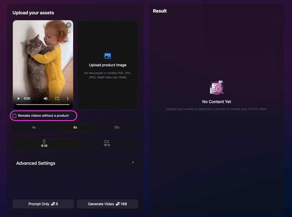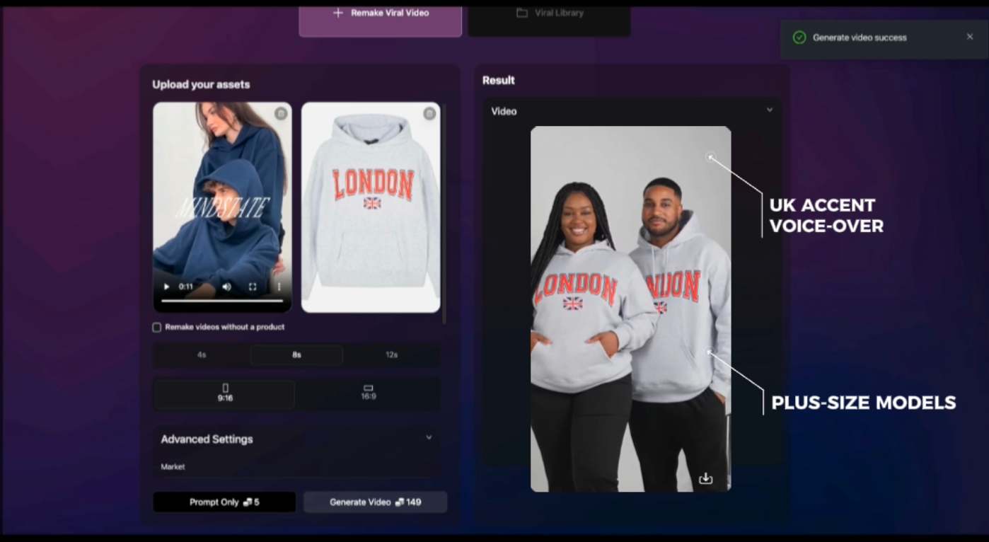 Lets you remake any viral video even if you don’t have a product, useful for remaking viral hooks, viral video to build TikTok/ Reels.. channels.