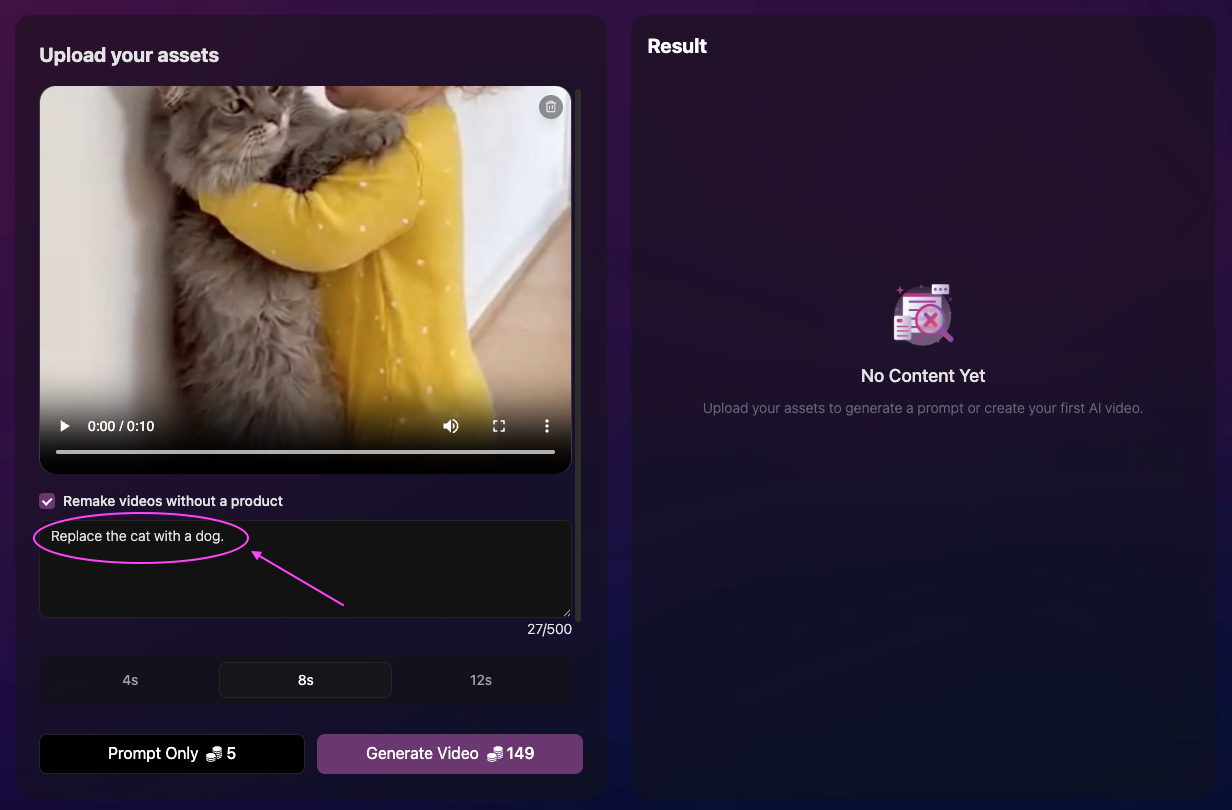 - (Optional) Enter what you want to change. Example: “Replace the cat with a dog"