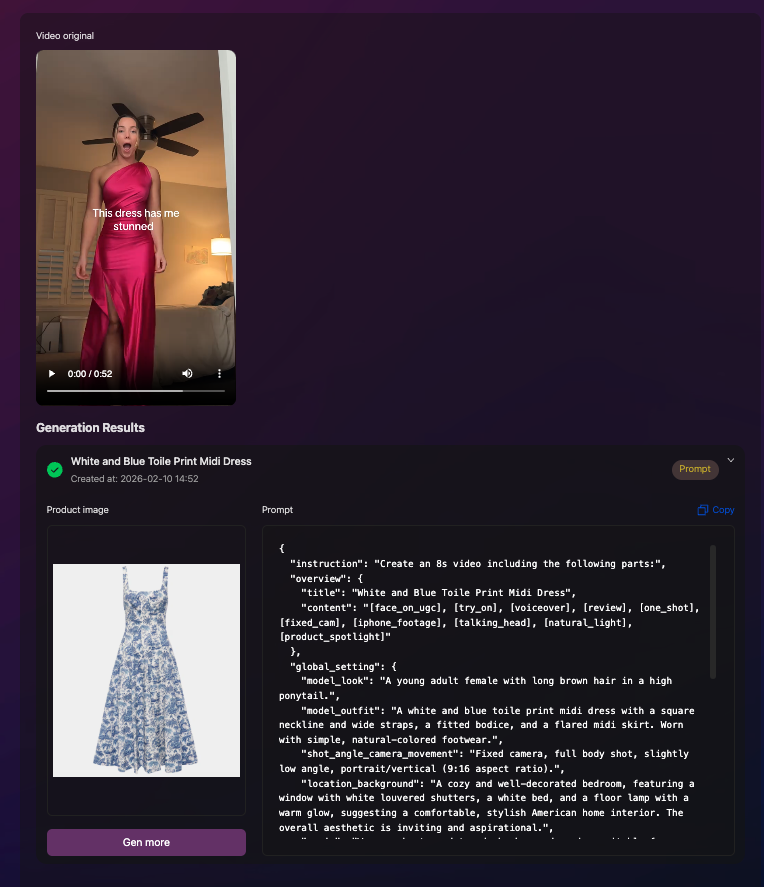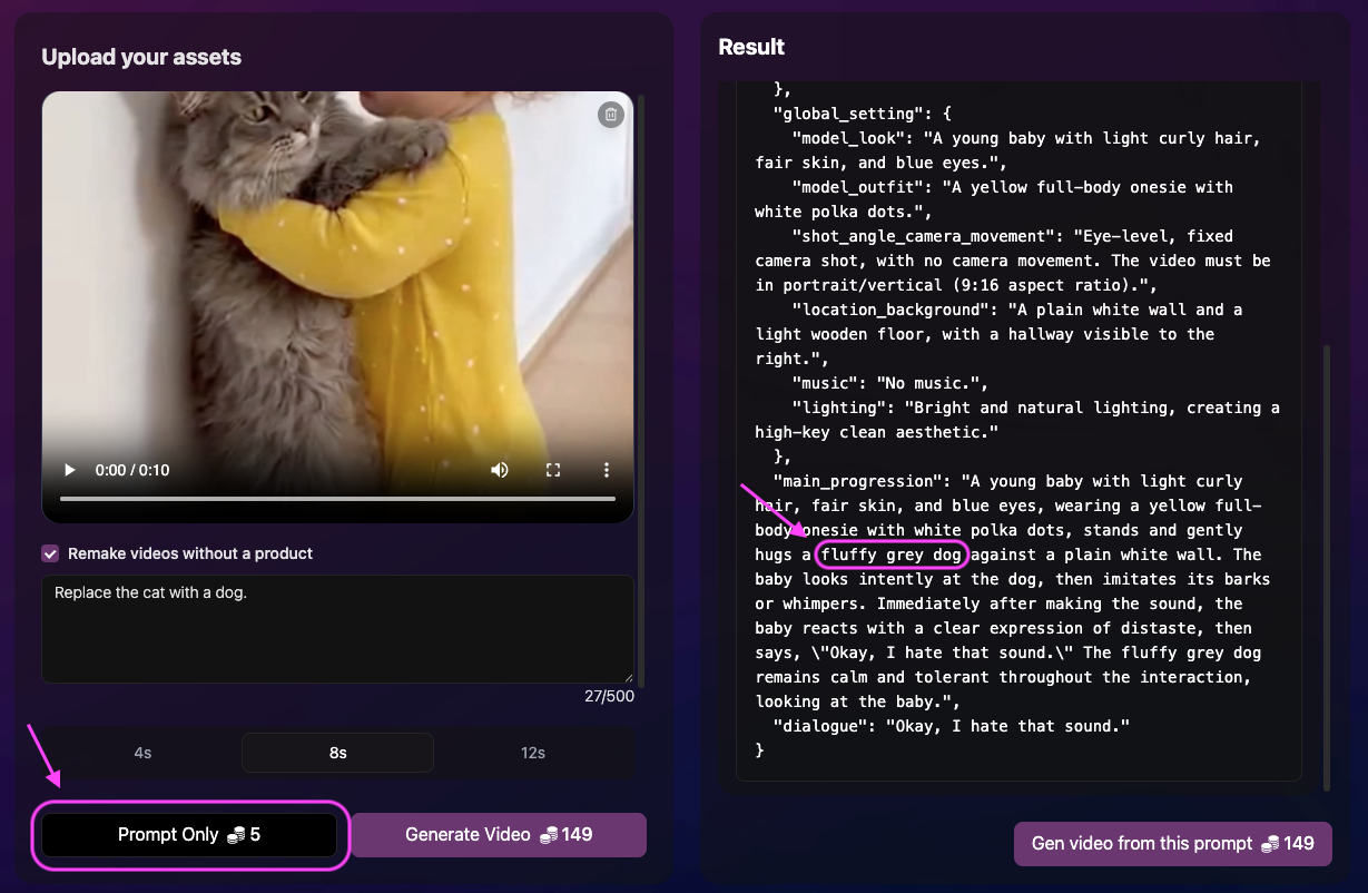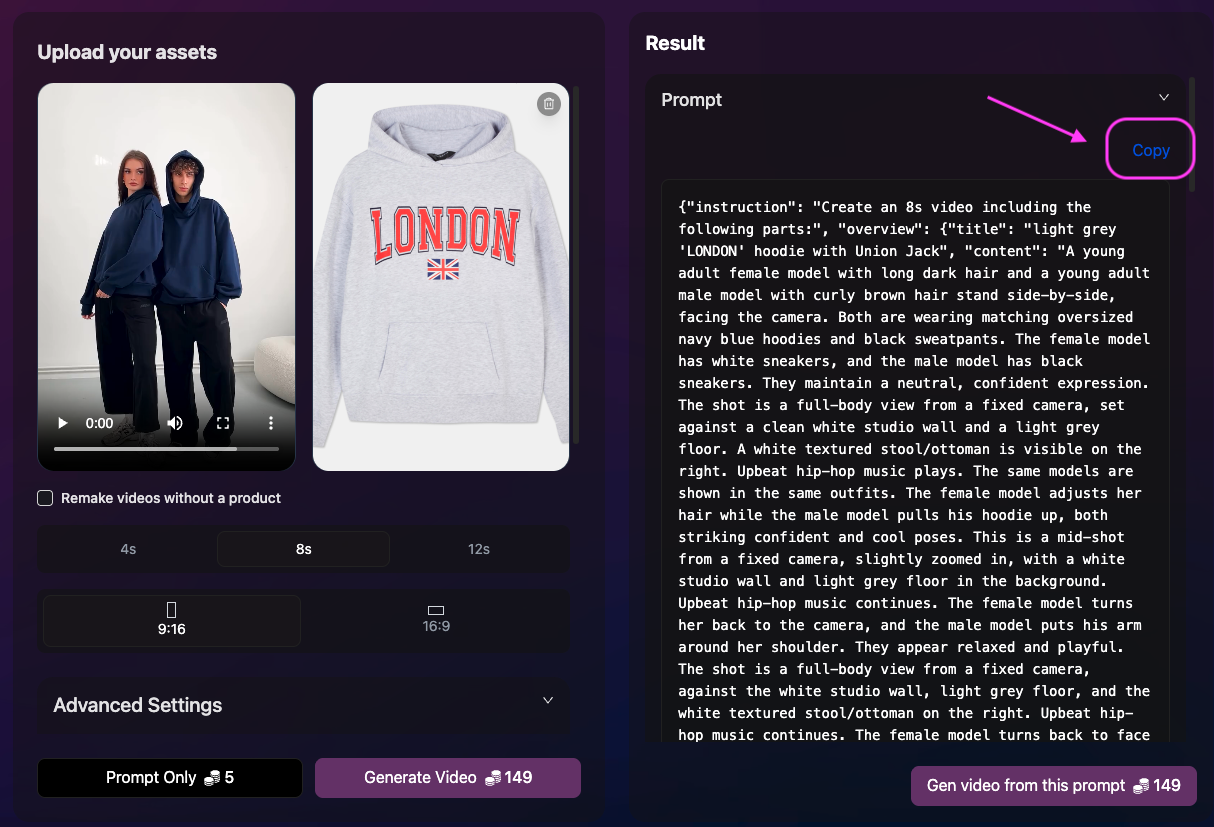 You can choose to get only the prompt (no video generation): 5 credits per prompt. If you already use tools like Sora 2, Veo3, Dreamina (Seedance), Kling, etc., you can copy the prompt and generate the video there.