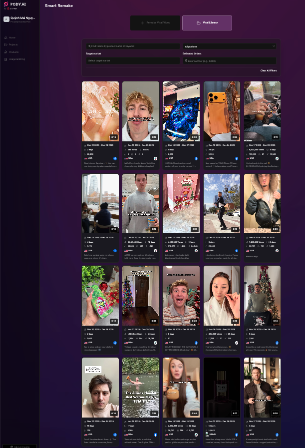 A library of viral e-commerce videos that have been proven to sell well on TikTok and Facebook. You can remake directly from these videos.