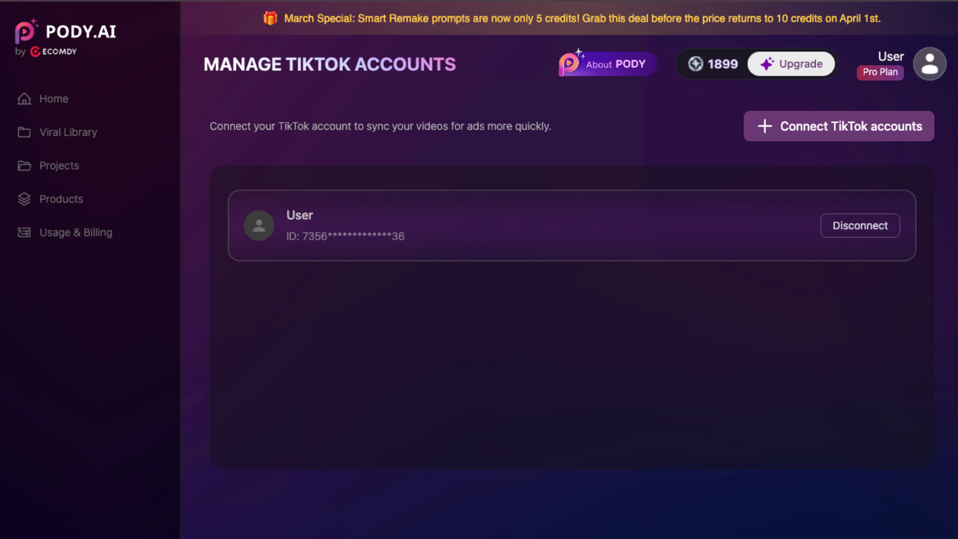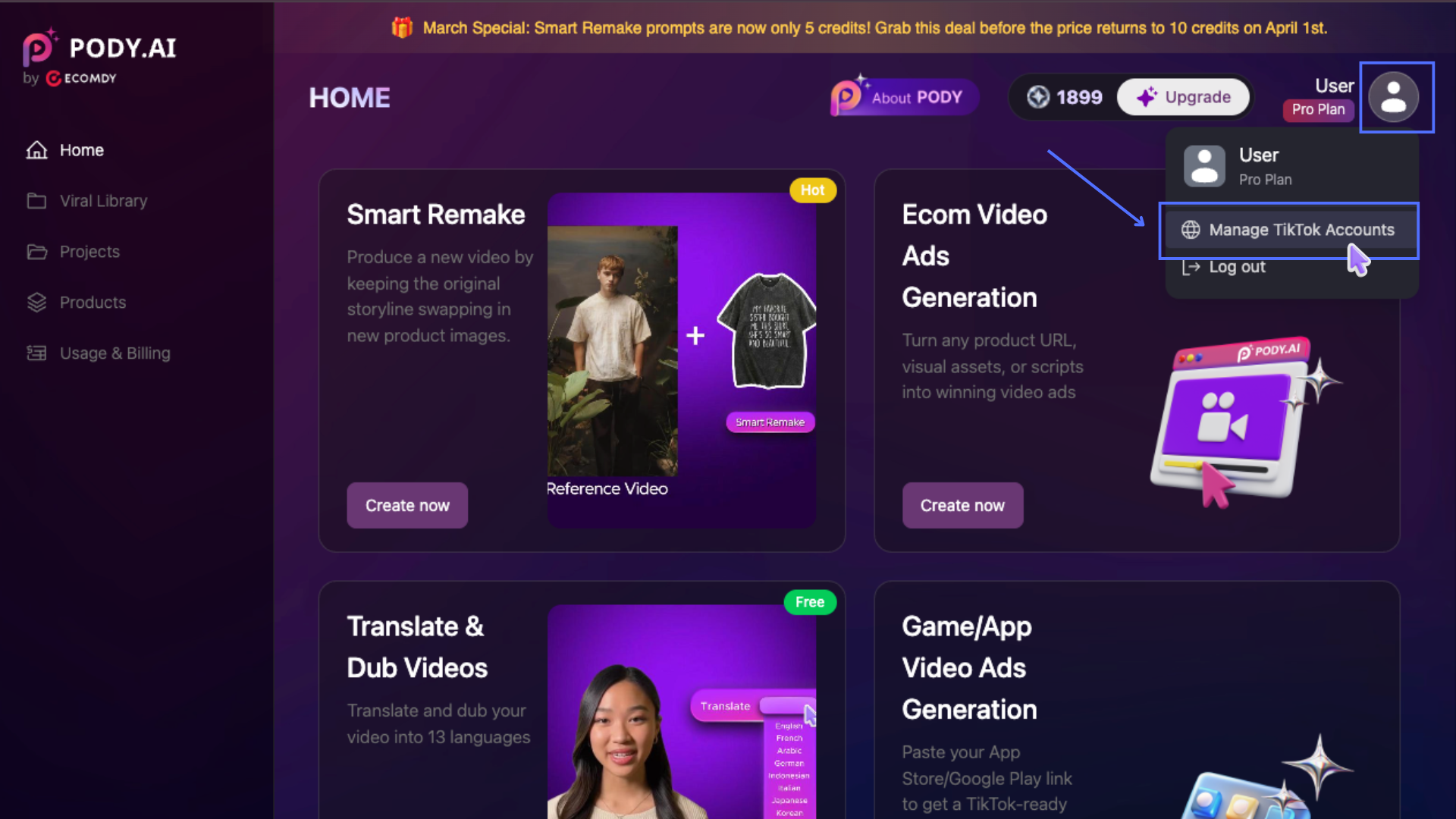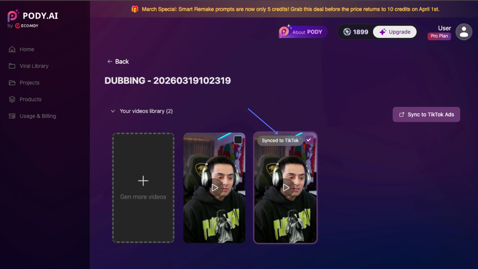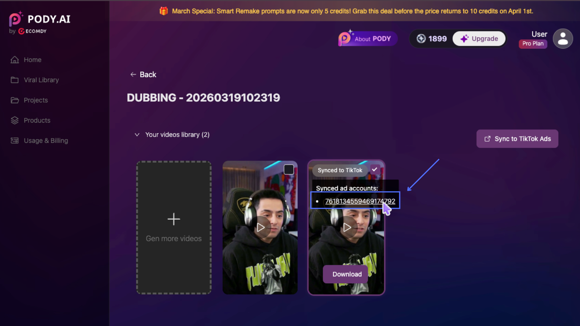 The Sync to TikTok Ads feature allows you to seamlessly transfer generated videos from Pody.ai to your TikTok Ads account, helping you launch campaigns faster without manual downloads or uploads.