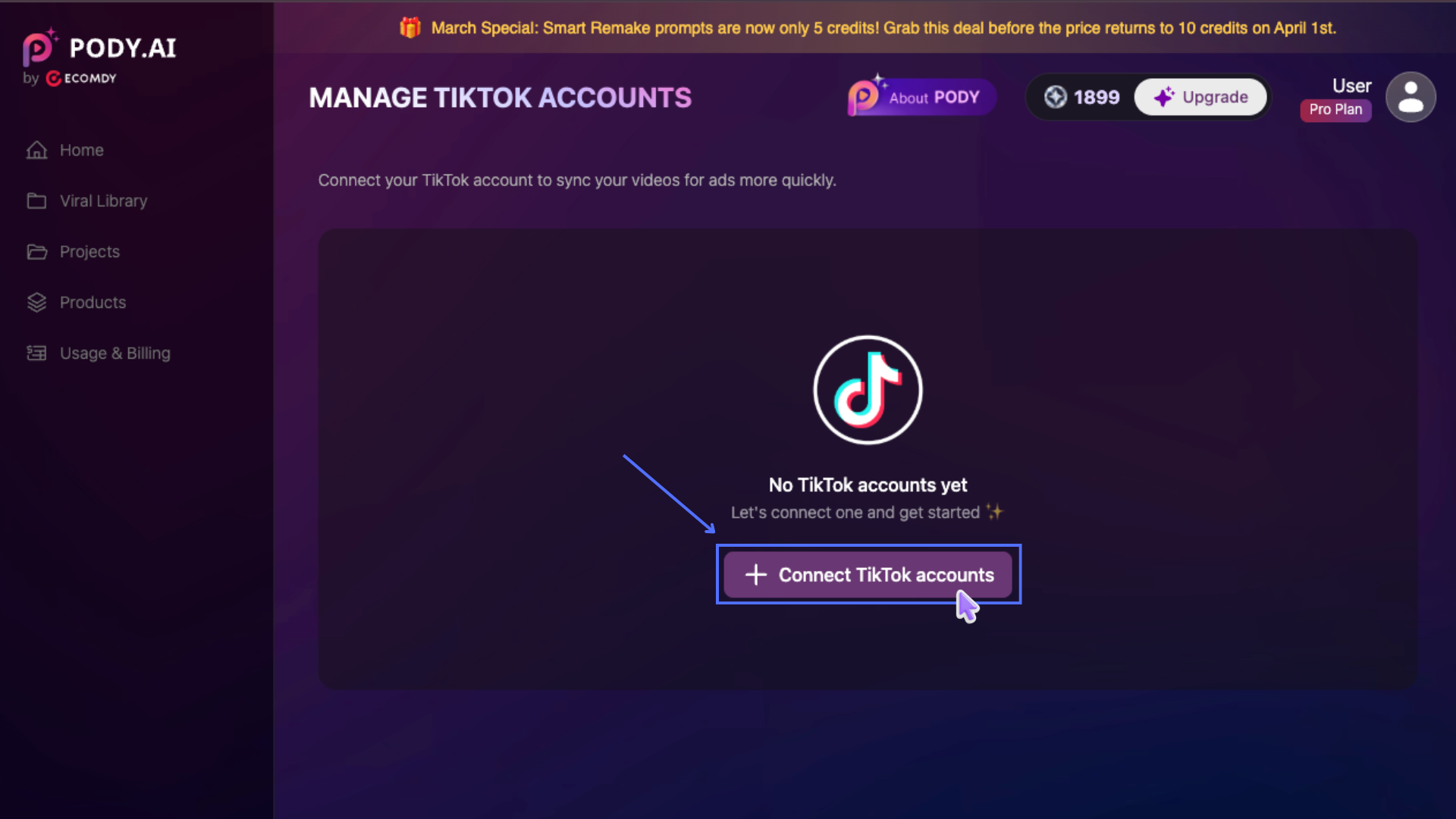 Once your TikTok Ads account is connected, you can sync videos directly from Pody.ai.