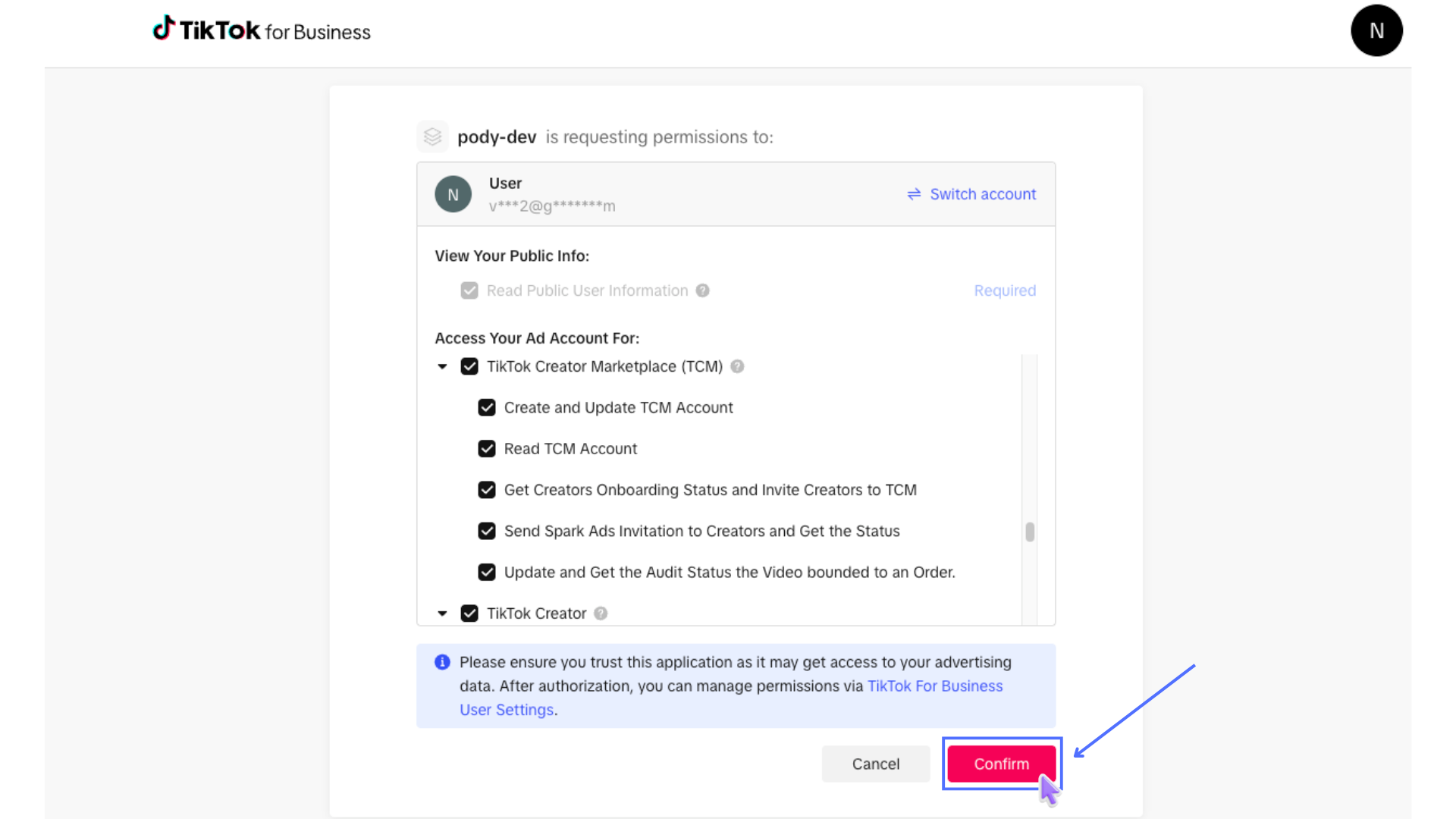 - After completing the process, you will be redirected to: https://app.pody.ai/tiktok-account. A success message will be displayed, and your TikTok Ads account will be successfully connected.