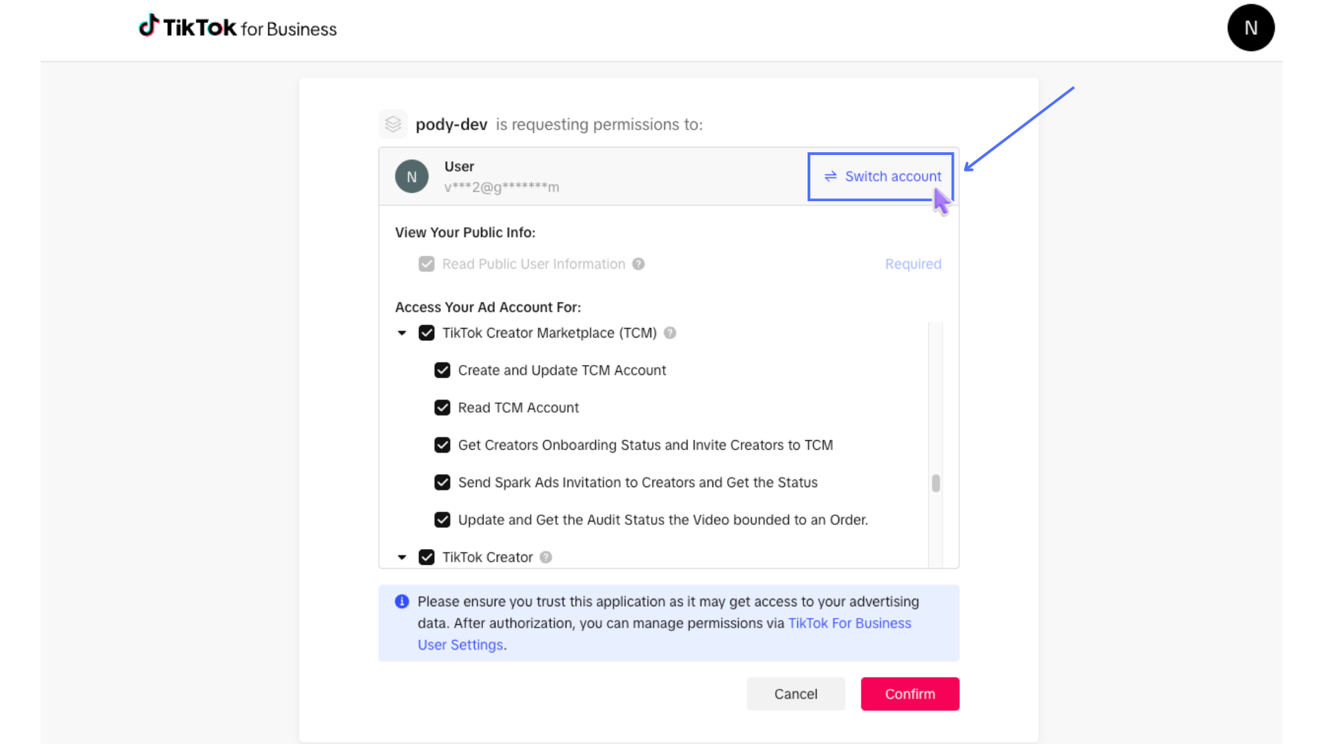 - To connect to another TikTok Ads account, click Connect TikTok Account. Select Switch Account and repeat the steps above.
