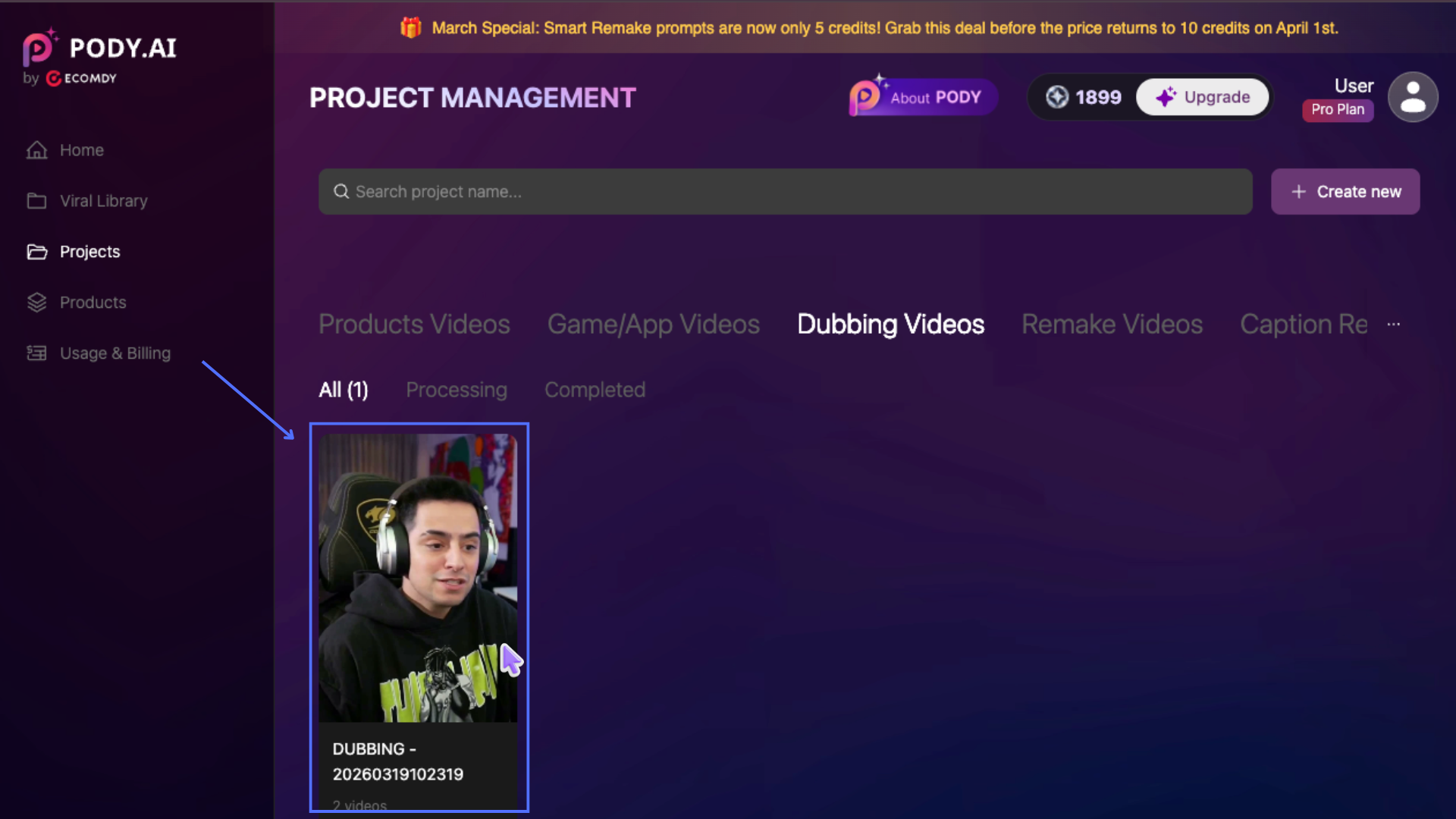 After generating videos using Pody features, you can sync them immediately from the result screen or find them later in the Project section by selecting the corresponding project.