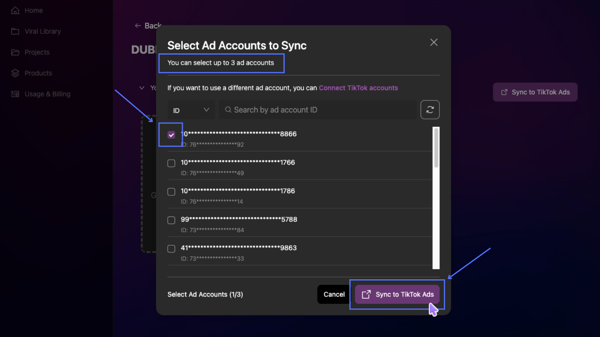- In the popup, choose the TikTok Ads account(s) you want to sync to (up to 3 accounts). Click Sync to Tiktok Ads to start syncing.
