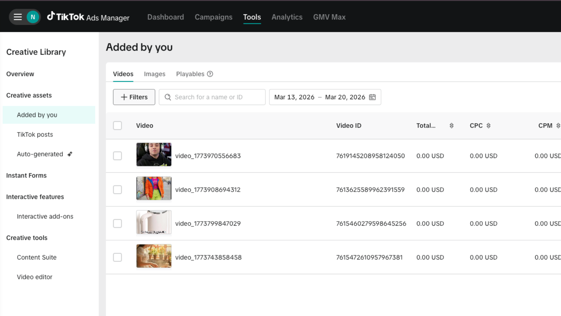 - Click on an account to open its Creative Library of the selected TikTok Ads account, where the synced video is stored